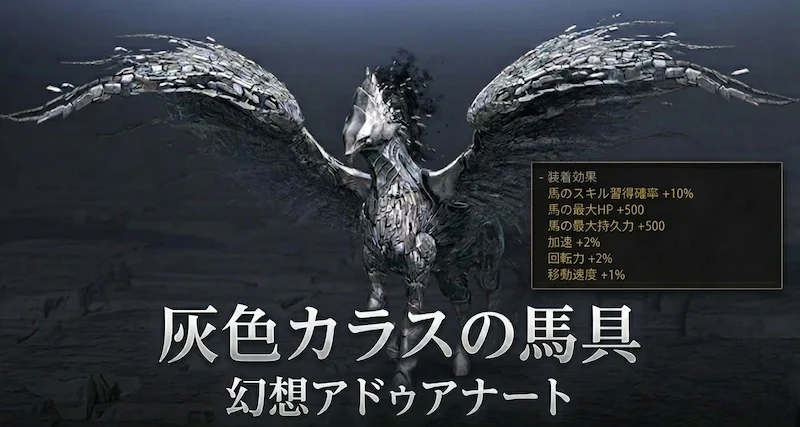 黒い砂漠に登場する幻想馬です。獲得時にオスかメスを選択できるので、微睡みチャレンジを考えている方にも嬉しいポイントですね!