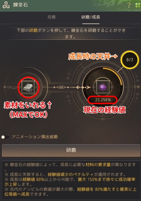 まず始めは「研磨」からスタート。「研磨/成長」タブに切替え、錬金石をセットします。