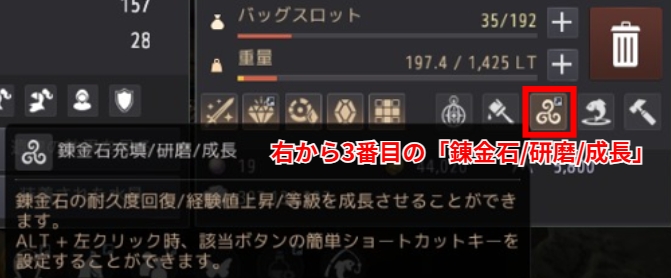 まずは錬金石メニューをバッグ(I)の下部から開いてみましょう。