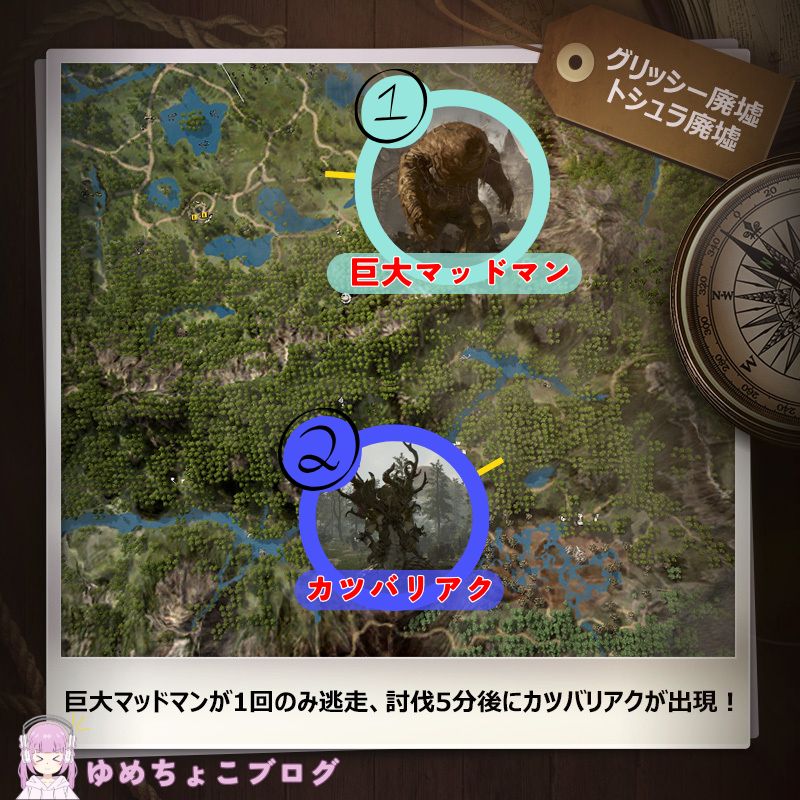 - カツバリアク:巨大マッドマン2を討伐した5分後に出現します。