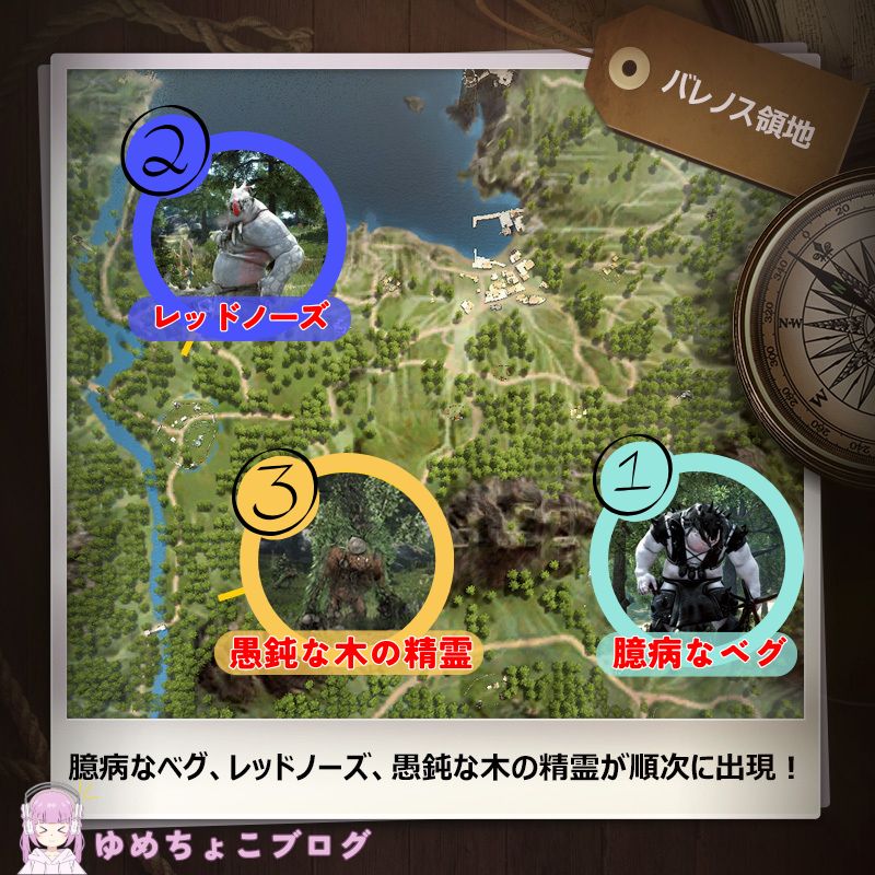 バレノス領地には「臆病なベグ」「レッドノーズ」「愚鈍な木の精霊」の3体が順番に出現します。