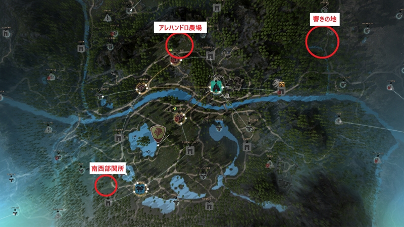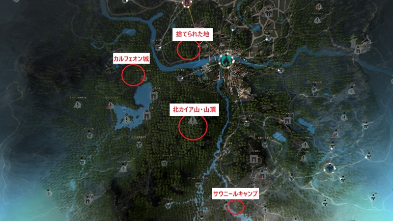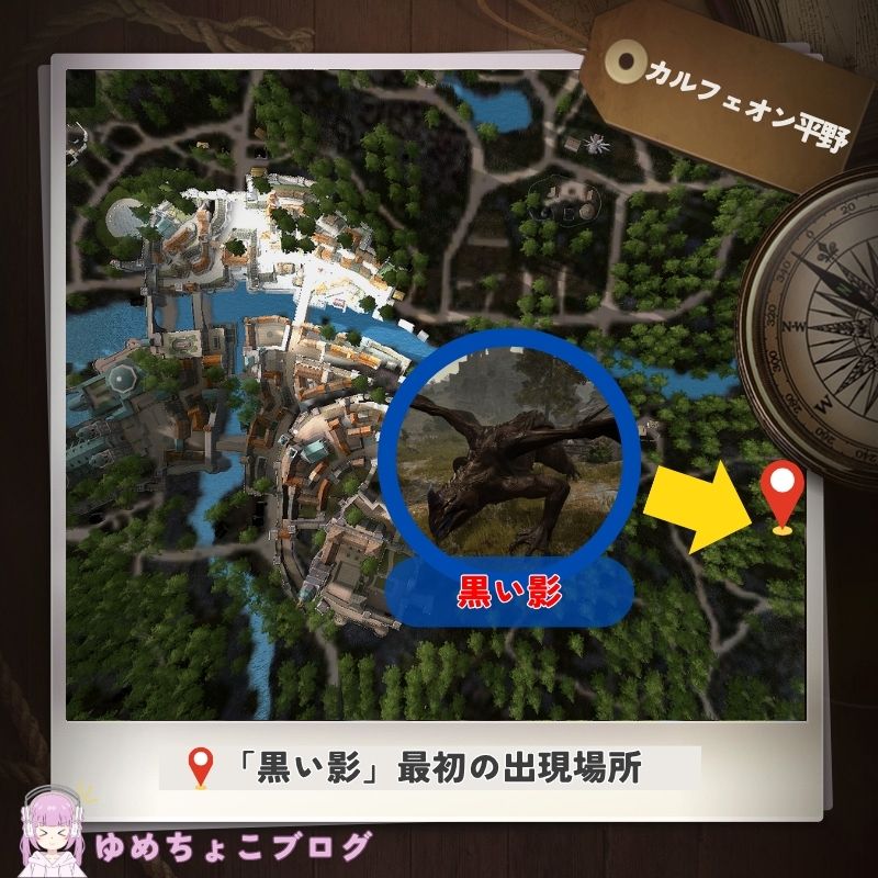 カルフェオン平野に出現する最初の黒い影を討伐すると、以下の場所からランダムに再出現します。