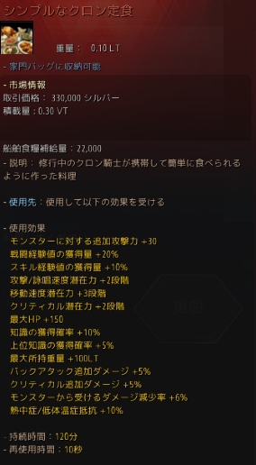 狩りで使用する料理は「シンプルなクロン定食」一択です。狩りをする際は絶対食べましょう!
