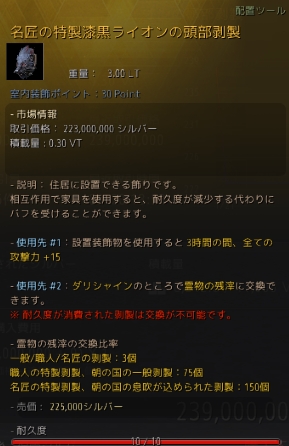 名匠の特製漆黒ライオンの頭部剥製以外でも「ワールドボス家具」や「インプ隊長の剣」が効果時間が短いですがオススメです!