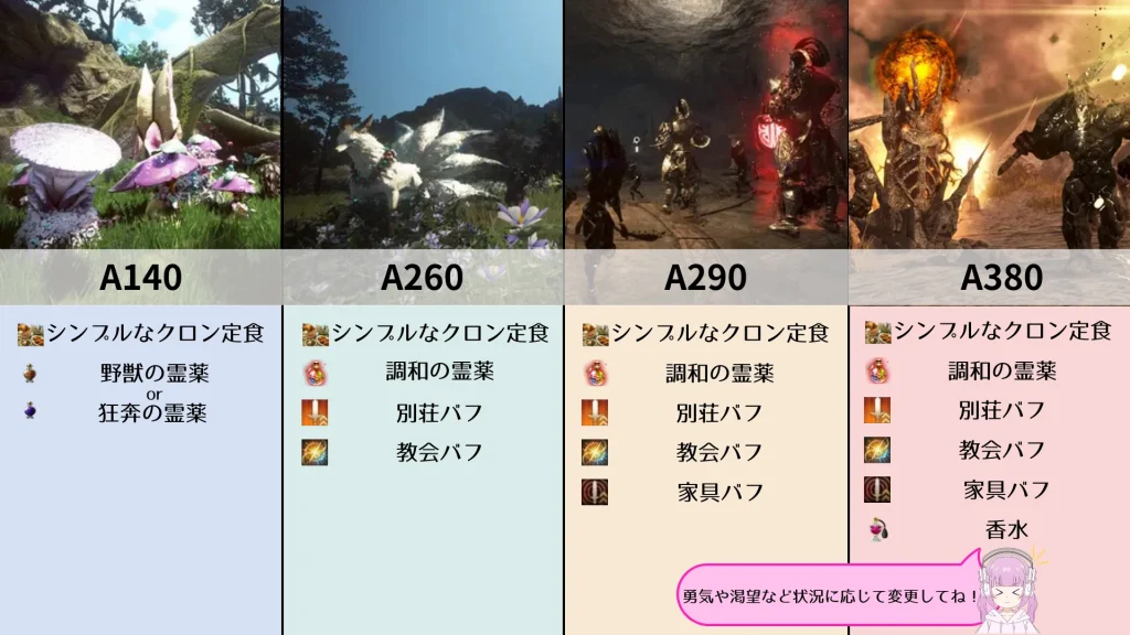 | 効果 | 別荘バフ | 教会バフ | 家具・霊物バフ | クロン定食 | 勇気の香水 | 調和の霊薬 | クログダルの咆哮 | 合計 |