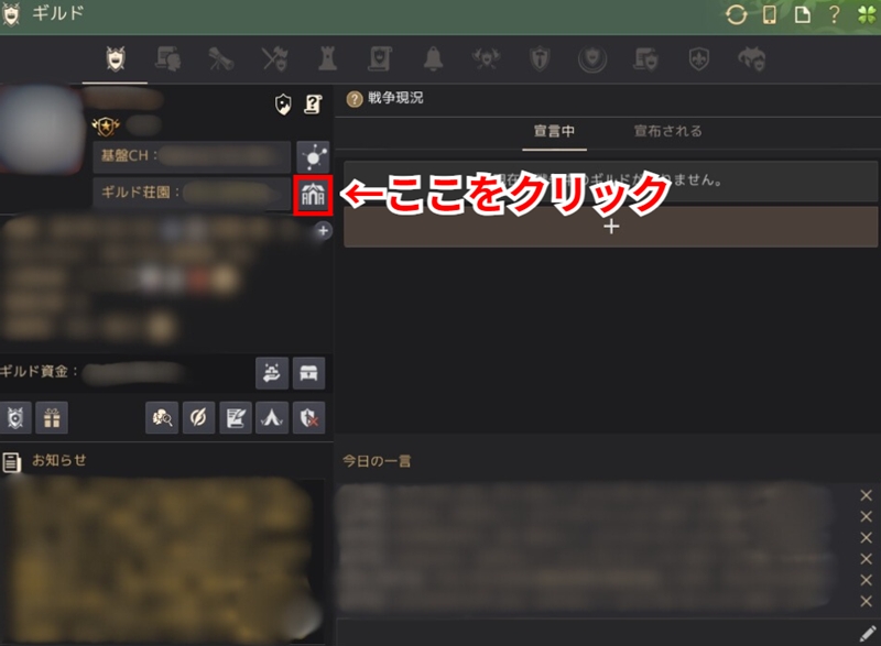 ギルド荘園を所持しているギルドでは、ギルド家具の設置及び利用が可能です。ギルド(G)タブを開き、ギルド荘園に直接アクセスできるためどこからでも家具バフを使用することができます!