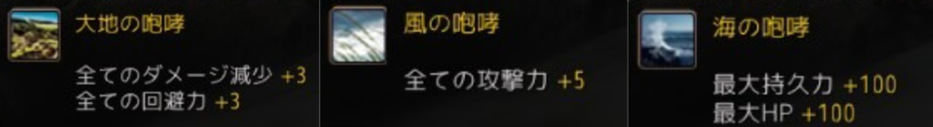 クログダル馬具の5セット効果で、大地・風・海に対応したバフ効果を得ることができます。