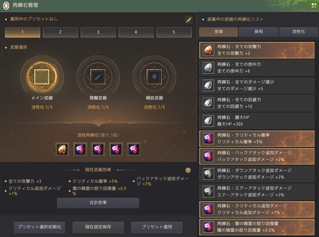 君王武器と太初のアルティニソルには再練石を通して5つの追加効果を付与することができる。また、5個の再練効果を付与した場合、他の再練石効果に変更することも可能。