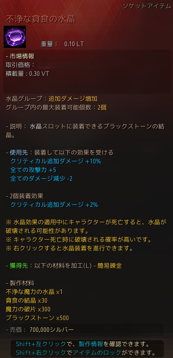 既存の「不浄な魔力の水晶」と比較すると全ての攻撃力が+3増加されています!2つ装着することで攻撃力を+6上げることができるので優先的に製作していきたいですね。