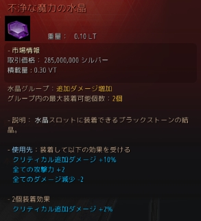 残酷な刺殺の水晶と反逆する精霊の水晶は7~9億シルバーと高値ですが、入手方法が労働者やギルドレイド、アイテム交換等豊富なので積極的に着けれるようになると狩りが楽になると思います。