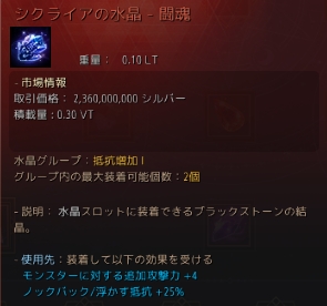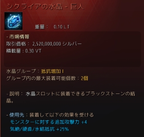 シクライアの水晶は「古代自然の魔力水晶」の上位版であり、抵抗+25%とモンスター追加攻撃力+4上昇するかなり強い水晶です。