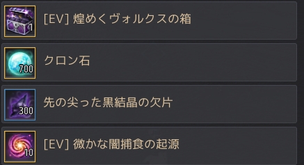 先の尖った黒結晶の欠片・[EV] 煌めく強化支援選択箱・クロン石で81.565%を占めていて高い確率で外れとなりそうです。